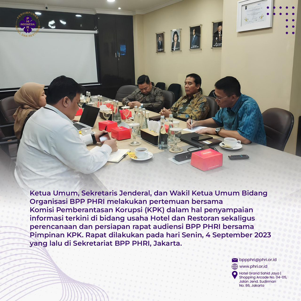 RAPAT PHRI BERSAMA KEMENPAR TERKAIT PERSIAPAN ASIAN GREEN HOTEL AWARD PADA 3 NOVEMBER 2023 DI HOTEL GRAND SAHID JAYA