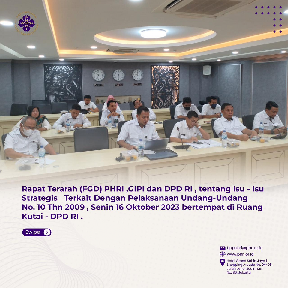 RAPAT TERARAH (FGD) PHRI,GIPI DAN DPD RI TENTANG ISU-ISU STRATEGIS TERKAIT DENGAN PELAKSANAAN UU NO.10THN 2009. SENIN, 16 OKTOBER 2023 DI RUANG KUTAI DPD RI